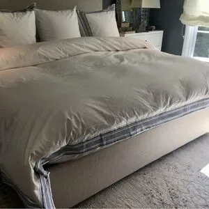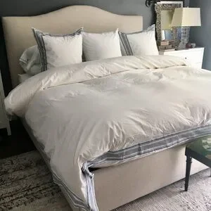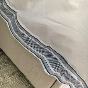 100 % Cotten. Excellent condition. Button closure. Missing one button. White with Blue trim. Bark Beaumont White. Crisp, Clean, Coastal.
