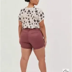 🔑 Keywords: Torrid shorts size 16, stretch sateen shorts, 5 inch inseam, mid-rise shorts, ginger mauve, dressy casual shorts, plus size shorts