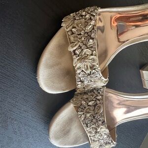 Badgley's Finesse Ivory Satin block heel with ankle strap. Crystal and flower embellishments.