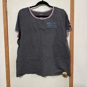 Comfy and casual Torrid Active tee in a soft heather charcoal gray with mauve trim at the neckline and sleeves. Features a positive graphic at the chest that reads “Meditate Hydrate & Breathe” in blue lettering. Relaxed fit with short sleeves makes it perfect for lounging, workouts, or everyday wear.