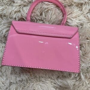 Keywords: pink mini bag, Barbiecore, rhinestone bow, patent leather crossbody, Y2K party bag, glam top handle purse