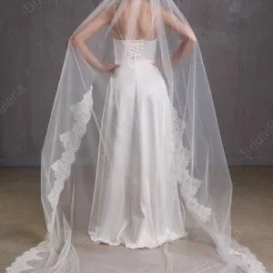 A modern cathedral lace trim veil. This one-tier veil is the perfect finishing touch for any wedding gown. The soft tulle of this floating lace bridal veil makes it look nothing short of effortless chic