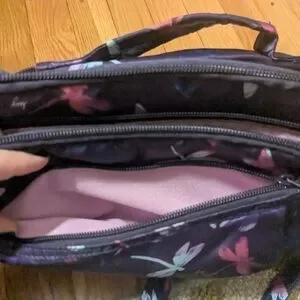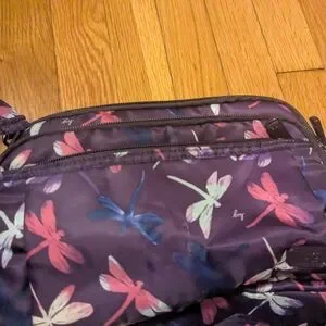 Lug crossbody in good condition, no tears. Several inside and outside pickets. Purple with vibrant dragonfly print.