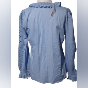 Charming light blue long sleeve blouse with eyelet details. Features button-down front and ruffled collar and ruffle sleeve as seen in photographs. Extra Small.