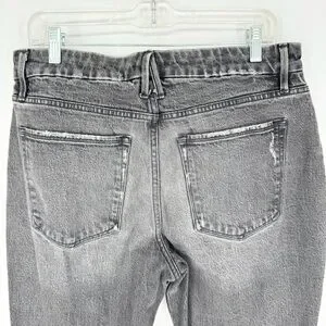 Clean hems, some distressing details, straight ankle leg fit