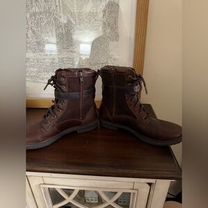 UGG Women's Kesey Motorcycle Boot in perfect condition with light signs of wear.scuffs in front as pictured, Crafted from waterproof leather with seam-sealed construction, the Kesey is a versatile lace-up boot with a vintage look, zip entry, and soft wool lining. The sole is made of Spider Rubber, offering superior traction in wet and dry conditions. Pair yours with nearly any outfit, from denim to dresses. This product was made in a factory that supports women in our supply chain with the help of HERproject, a collaborative initiative that creates partnerships with brands like ours to empower and educate women in the workplace.