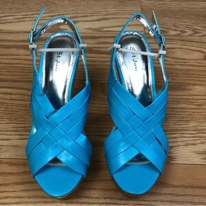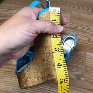 Y2K-inspired blue turquoise cork wedge sandals with silver detailing — perfect for adding a pop of color to your look!