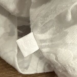 Subtle swirl / abstract print in light ivory/cream tones. Sleek performance fabric (probably viscose/poly blend) designed for comfort and movement. Sleeveless, slightly cropped fit with a sporty vibe.