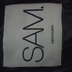 Sam's puffer goose down and feathers jacket flaunts a fur trimmed hood andis styled with a metallic finish.