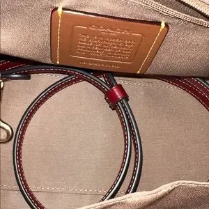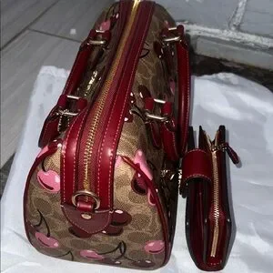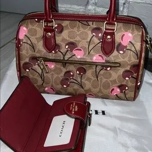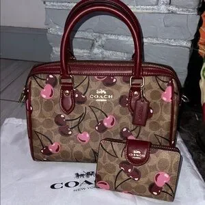 Chic Coach satchel with cherry print. Brown and pink tones. Includes matching wallet. Stylish and functional. Selling this cherry set