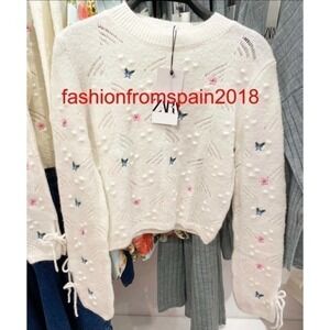 Nwt size S ZARA Floral knit sweater. Round neck long sleeve sweater with tie cuffs. Contrasting floral embroidery detail