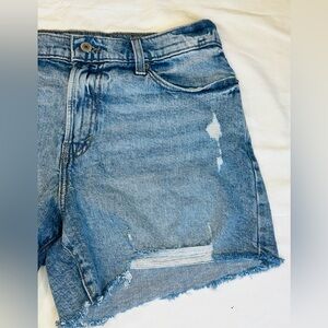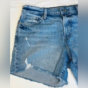 Stylish blue denim jean shorts in 90s Midi Style. Cutoff/distressed style. High rise that flatters all body types. Size 8/29. In excellent condition. Gently worn. Comes from a smoke free home.