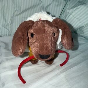 Brown dachshund dog wearing yellow sweater and removable Santa cape
