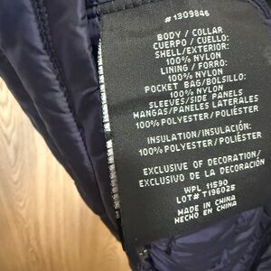 Stylish navy and black quilted jacket with zip closure. Perfect for cool weather.