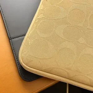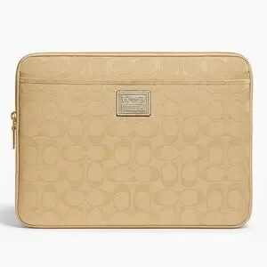 Chic and timeless Coach Signature laptop sleeve in a soft champagne beige jacquard with metallic shimmer detailing and gold-tone logo plaque.