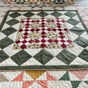 Beautiful geometric patchwork quilt with green, red, and cream patterns. Perfect for adding a cozy touch to any room. Has tiny farm animals in the details