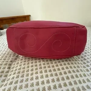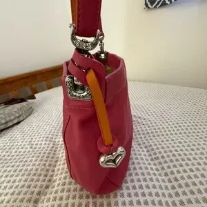 Chic and stylish pink women's bag with a heart design. Perfect for adding a pop of color to any outfit. Pre loved. Adjustable shoulder strap. With hang tag. Magnetic top closure. Zip pocket inside with floral lining.