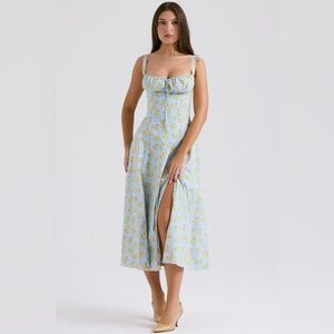 You'll feel ultra feminine in our 'Carmen' dress that's the perfect fit for Spring and Summer garden parties. It's cut from stretch cotton in a gorgeous soft blue vintage floral print and has a corseted bodice with a beautiful lace up back. The gathered bust has a drawstring tie and the side split adds a little sexiness to reveal a flash of leg.