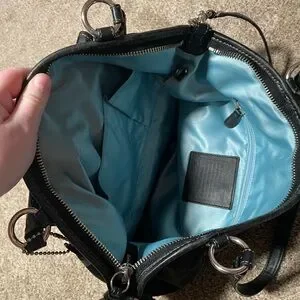 This is an excellent condition shoulder bag from Coach. It is the Leah bag in a black canvas. It is very spacious inside. There are a few marks inside the lining but nothing on the outside. Measurements can be provided upon request.