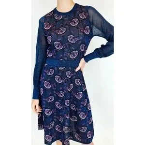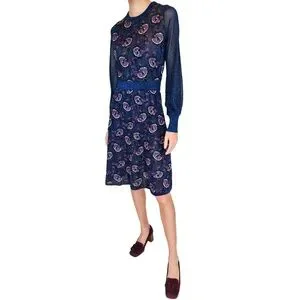 This Happy Sheep dress features a striking navy lurex fabric adorned with playful pink and violet prints. Sheer navy sleeves add a delicate, airy touch that balances the dress's bold design.