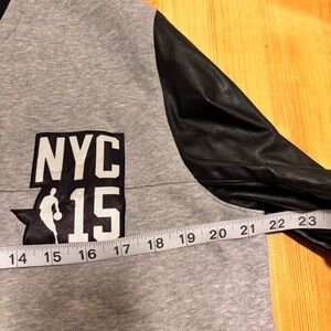 Stylish Adidas varsity jacket. Gray body with black sleeves. Features star design and NBA All-Star 2015 embroidery.