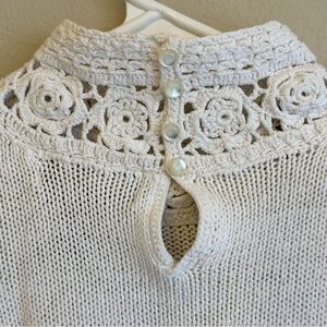 Measurements in pictures. Delicate crocheted lace neck with button closure and key hole detail.