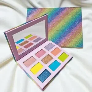 Vibrant eyeshadow palette with a rainbow of colors. Perfect for bold looks.