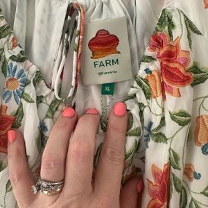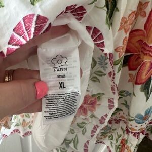 Vibrant dress with floral design. Features puff sleeves. New tag farm Rio Bloom garden, off-white, short sleeve mini dress size extra large.