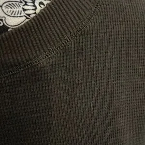 Chic dark green long sleeve top. Features a convenient chest pocket. Waffle weave material is on the front placket only. The rest of the shirt is a thick jersey. Perfect for everyday style. It’s an incredibly dark olive/forest green. The first picture doesn’t do the color justice. If you have any questions, please ask. It was hard to capture the color correctly.