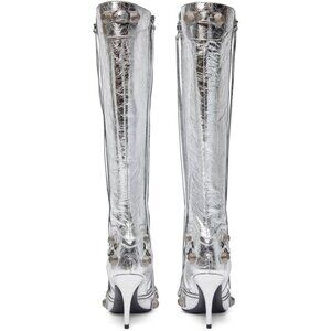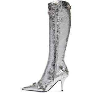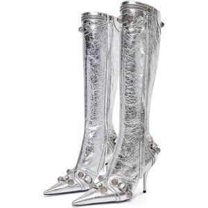 ⚡Women's Silver Stiletto Black Knee High Boot Sexy Pointed Toe Fashion High Heel