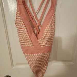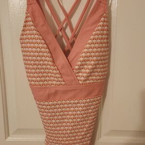 Stylish tankini top with a lively peach and white pattern. Ideal for styling at the beach or pool. This item is a women-owned Business on a MISSION to PREVENT SKIN CANCER! BLOCK 98% UVA and UVB RAYS.