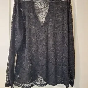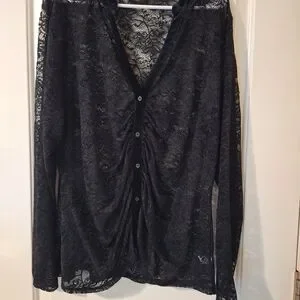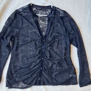 Lane Bryant Black Lace Button Front Top Size 20 Sheer Ruched Blouse Velvet Trim