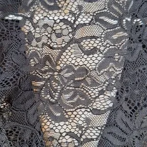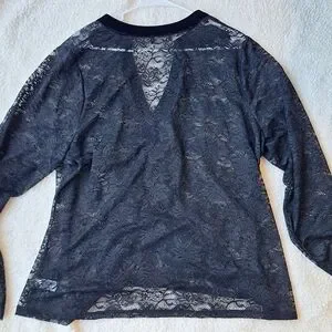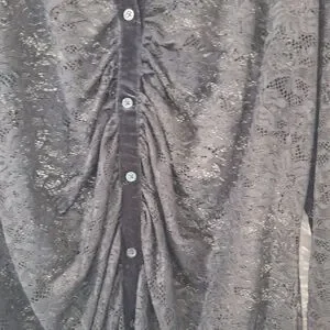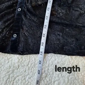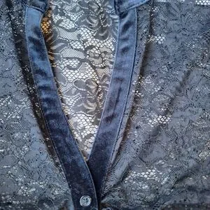 Style: Button front, long sleeve, sheer lace, ruched front, velvet trim