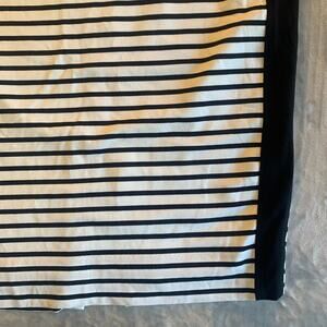 This chic pencil skirt from White House Black Market features a black and white horizontal stripe pattern and solid black side panels with decorative button details. The tailored fit is perfect for a polished, professional look.