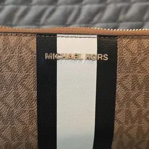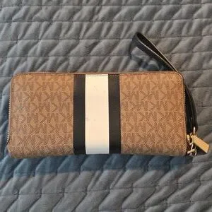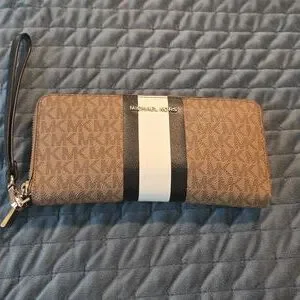 Elegant Michael Kors wristlet with signature logo pattern. Features a sleek black and white stripe accent. Includes a practical wrist strap.