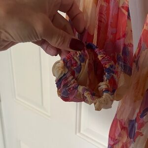 Vibrant floral dress with long sleeves. Features a flowing design and multicolor pattern. Perfect for any occasion.