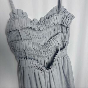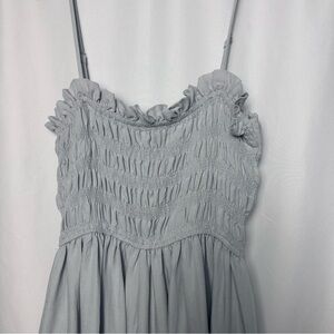 The Mable Dusty Blue Smocked Romper in size M is a stylish and comfortable one-piece outfit perfect for casual occasions in the summer and spring seasons. Made from cotton, this sleeveless romper features a flattering fit with smocked details and a regular style. The Romper comes in a beautiful blue color and includes a pair of shorts, making it ideal for a variety of themes such as festival, beach, going out, nautical, bohemian, travel & places, and fun. This romper by Mable is a versatile and trendy addition to any woman's wardrobe.