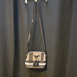 Elevate your style with this chic black and white crossbody bag. Perfect for any occasion, it features a sleek design with elegant tassel details. A must-have accessory for fashion-forward individuals.