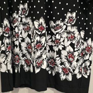 Elegant black midi dress with white polka dots. Features bold floral pattern at hem. Red accents add a pop of color. Perfect for any occasion.