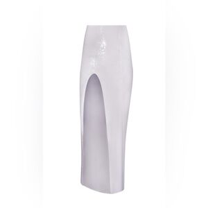 skirt- Skirt: 93% Polyester, 7% Elastane. Lining: 80% Polyamide, 20% Elastane. Made in the USA. The Ava Skirt is snow-white, sequined, and sultry with a slit cut up to there. Double down on the shimmer and style with the coordinating Sahra Top.