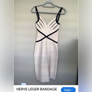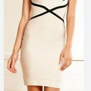 The dress shown in the image is a cream and black bandage dress by Hervé Léger. The brand is known for its signature bandage design, which creates an hourglass effect. The dress is often seen on celebrities and is available on various retail and consignment sites.