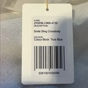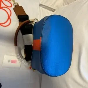 UK designer Orla Kiely Smile barkcloth bucket bag in bright blue and orange. Features a detachable brown leather handle and adjustable drop strap. 1 interior snap pocket and bright orange key strap. White leather flap snap closure. 9 1/2 “ wide x 8” tall. NWT Never used. All tags and protective coverings are attached. Orlakiely.com