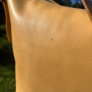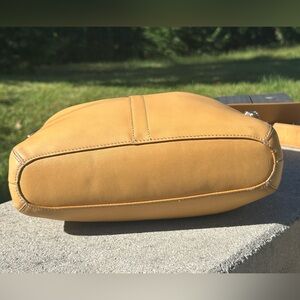 Coach 9326 leather Legacy Slim Shoulder Crossbody Bag in Camel. Has some spots and signs of use by zipper, strap and corners, please see pictures. Clean inside. Original hang tag. Silver hardware. Adjustable strap. Does not have leather zipper pull. Still a beautiful leather bag. Measures 10.5 x 9 x 2