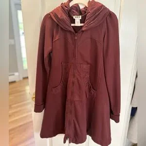 Chic maroon trench coat with a stylish hood. Perfect for layering in cooler weather.