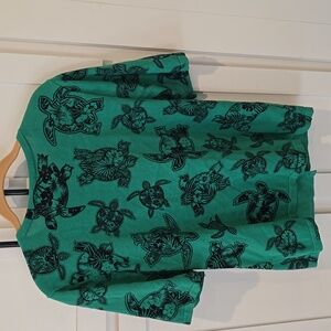 Green short sleeved button up cardigan with turtle print.
