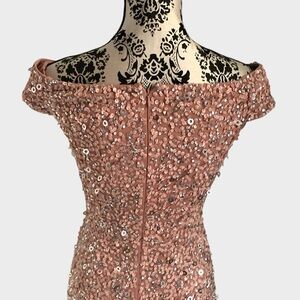 Breathtaking full length gown covered in shimmering blush and silver sequins with a flattering off-the-shoulder neckline. Elegant and curve-enhancing silhouette with a hidden back zip. Fully lined and perfect for special occasions or formal events.