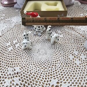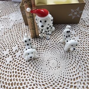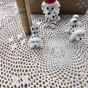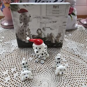 Charming Dalmatian dog art glass set by Pier 1. Features playful white dogs with black spots. Ideal for pet lovers.