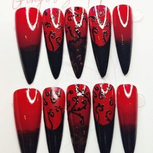 Press On Nails 10pc Long Stiletto Size Med. Red Black Gradient Swirl W Chrome
