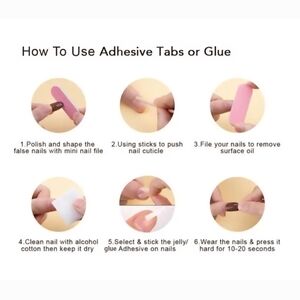 With adhesive tabs/glue it is highly recommended that you file/buff your nail beds so that they're a little rough. Once you apply the jelly tab to the fake nail and press onto your nail bed, do not wash hands or get wet for at least one hour, while periodically pressing on nails to ensure a strong hold to your real nails. Once nails have set dry and pressed for at least one hour, they can be trimmed and filed to personal style! Following these directions will guarantee you 14+ day wear!