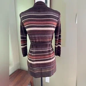Perfect fall knit cardigan with a striped pattern and built in belt. Sweater is in excellent condition, except for a tiny snag on the belt (also shown with a piece of fuzz, sorry about that🫠). Is missing the care tag. Was supposedly worn by an actor on the show The Cleaning Lady (I myself bought it from the prop sale for the show here in Albuquerque). Smoke free home; ships same or next business day. *Listing as a small based on measurements*
